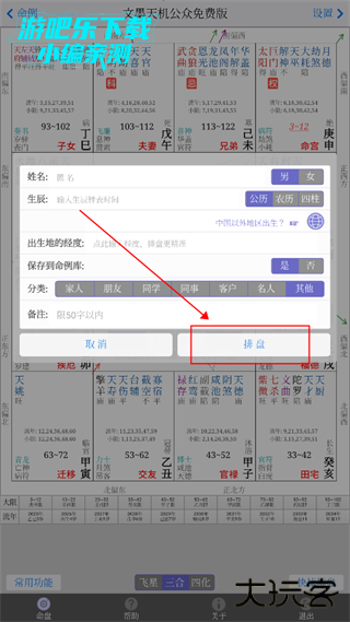 在排盘页面,点击右下角的“快捷排盘”按钮,弹出生辰输入窗口输入生辰后点击“排盘”按钮即可快速排盘。如果您希望保持此命盘,可以在输入生辰的同时选择“保存到命例库”为“是”,然后指定分类,即可直接将此盘存入命例库,无需切换到命例库页面操作。点击“排盘”即可 (如下图所示)