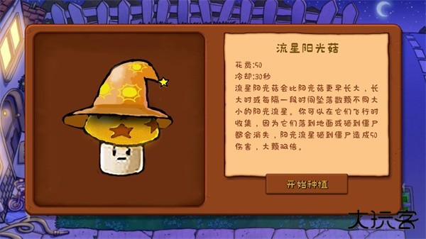 流星阳光菇会比阳光菇更早长大,长大时盛每隔一段时间坠落数颗不同大小的阳光流星,你可以在它们飞行时收集,因为它们落到地面或砸到僵尸都会消失,阳光流星砸到僵尸造成50伤害,大颗双倍。