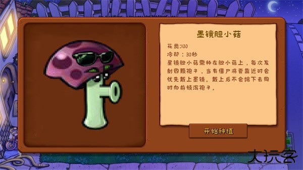 墨镜胆小菇需种在胆小菇上,每次发射四颗跑子,当有僵尸将要靠近时会优先戴上墨镜,戴上后不会缩下去同时向前倾泻孢子。