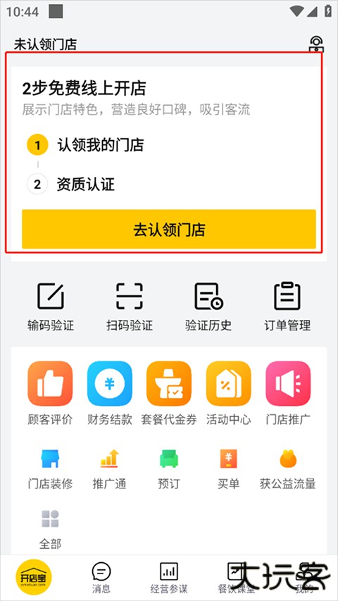 2、进入美团商家版app后将进入工作台,我们需要分两步免费线上开店,第一步先认领我的门店,第二步需要资质认证,认证结束后就可以使用软件的各种功能了。