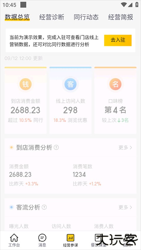 4、美团商家版可以查看数据总览,经营诊断以及同行动态信息,将根据这些数据帮你经营参谋。