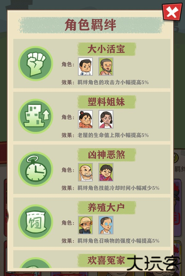 当然,不同角色之间也是有一股神秘的能量—羁绊。村名之间相互配合实力会大幅提升,比如郑妈妈和送水工邓哥就有养家糊口的效果,大幅度减少技能冷却时间,一人赚钱养家,一人在家带娃。
