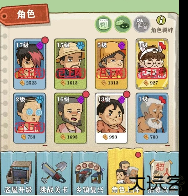 除了升级可以带来增幅外,上阵阵容的搭配也是一门大学问,不仅要综合考虑不同角色的定位,同时注意角色之间存在的羁绊加成。目前,现有的角色定位分为三类,分别是辅助类、攻击类和辅助类。这三大类的角色还是很好区分的,大家可以在角色面板中直观看到。同时,在搭配时,不要忘记点开角色羁绊,里面记录着各个角色之间的羁绊组合以及加成效果,比如郑妈妈和送水工邓哥就有一个养家糊口的效果,会较少我们15%的技能冷却时间。除此之外,还有增加攻击力的、增加攻速的、增加恢复的等等的羁绊。羁绊也是有强有弱,一些品质低的人物所带来的羁绊效果就比较弱一些,但是也是会增加我们的战斗力的。