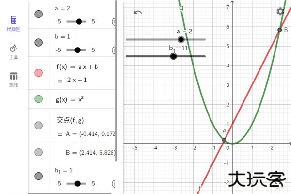 5、使用指令Intersect(f,g)【中文指令:交点(f,g)】创建f(x)和g(x)的交点。交点A和B显示在绘图区中,而交点的坐标显示在代数区中。