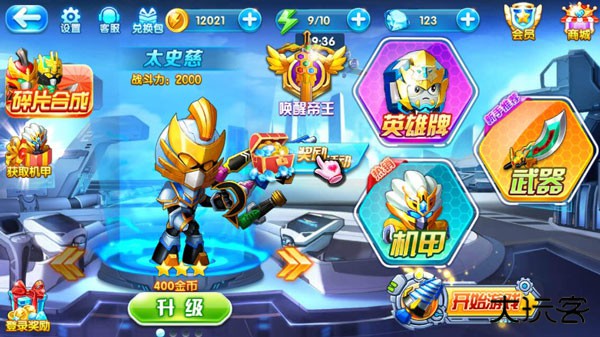 1、首先进入游戏,在闯关的初始界面下(如下图所示),分别有英雄牌、武器、机甲等众多选择。
