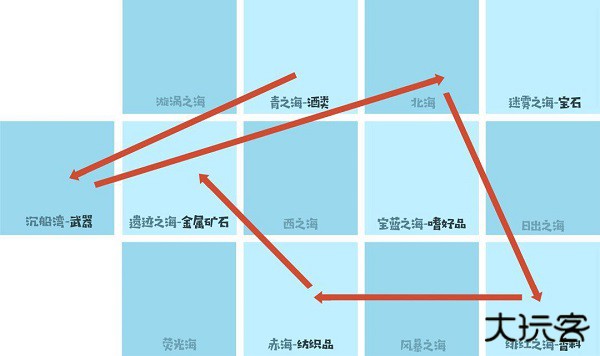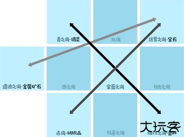 从遗迹之海购买金属矿石类商品贩卖到宝蓝之海,再从宝蓝之海购买嗜好品类商品贩卖到遗迹之海。