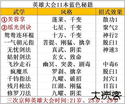 ②21岁,离尘迷踪升满级,找个兵器剑。第一届京师英雄大会三关全胜得一本蓝色秘籍,可SL,建议芙蓉掌或者瑶光剑诀。之后25岁、29岁的英雄大会同理。(萌新可以打打前两关,会奖励兵器护甲)