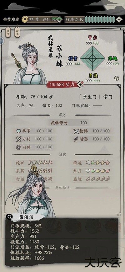 ⑤江湖传闻每年都是随机刷新,如果追求极限,可以每年都SL称号相关的事件,这个加的属性是在四属性999额外的属性。丹药也好,功法也好都是加999之内,达到999后再升功法、吃丹药也不加属性。