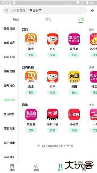 3、想要下载的应用软件也可以通过精品、排行和分类进行查看;