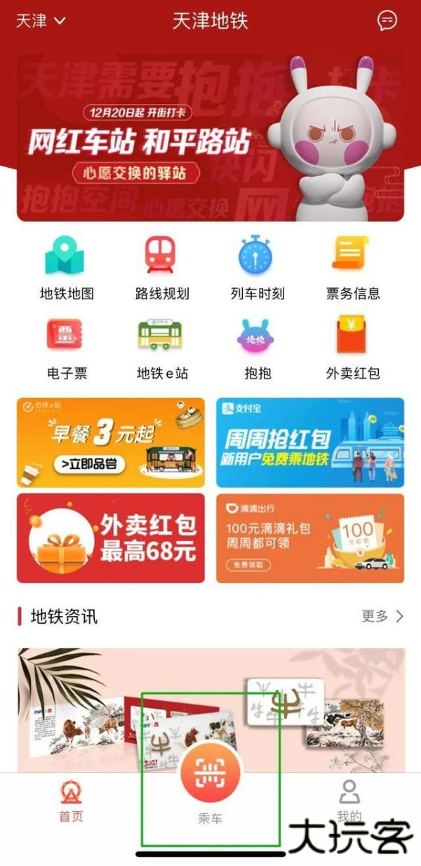 1 天津市民使用“天津地铁APP”*乘坐天津轨道交通时,需先将“天津地铁APP”升级到最新版本并打开,点击首页【乘车】按钮。