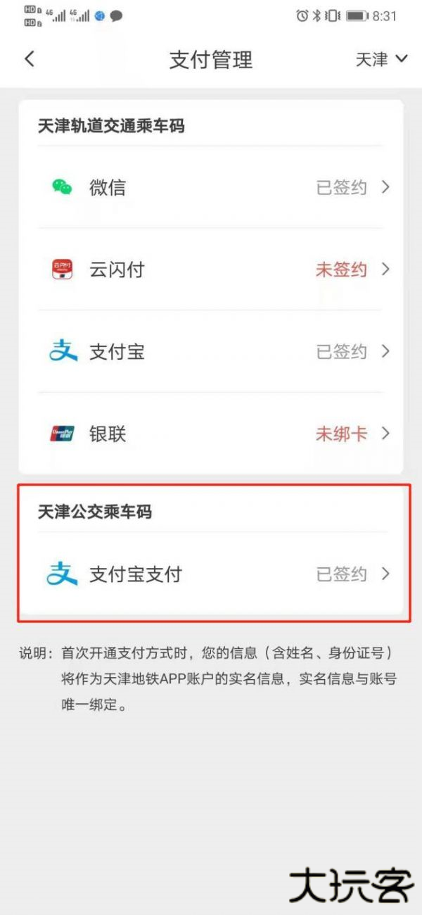 3 授权成功后,乘客需开通“支付宝支付”作为乘车费用的扣费渠道。支付方式开通成功后,可通过乘车码页面的天津公交乘车码刷码乘坐公交车。