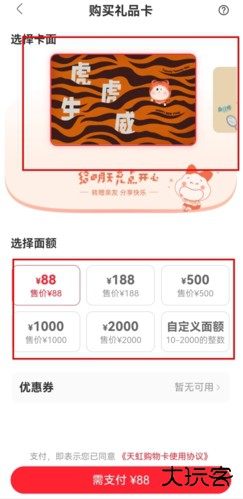 2、在购买礼品卡界面选择自己喜欢的卡面,以及充值的面额,最后支付即可。