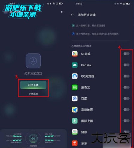 2、第一次打开,我们需要先添加游戏,如果手机里还没游戏,点击“前往下载”,如果已经有游戏的话,点击下方“手动添加”,打开对应游戏后的开关就可以添加了;