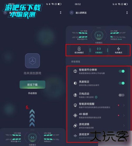 3、在“游戏助手”中上拉可以进入控制台,在这里有3种模式可以选择,分别是“低功耗”、“均衡”和“电竞模式”,如果对打游戏画质延迟等要求比较高的话,推荐选择“电竞模式”。下方还支持“4D振感”、“闪电启动”、“智能游戏提醒”等辅助功能;