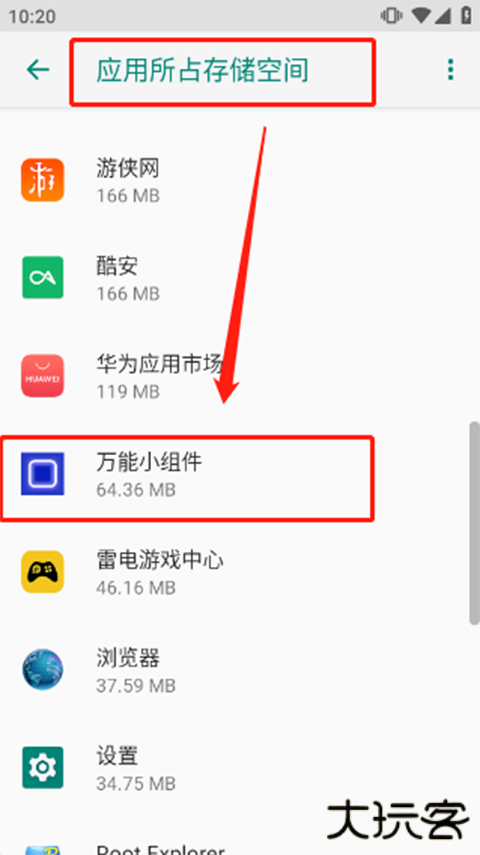3、接下来进入“应用所占内存空间”,找到其中的万能小组件