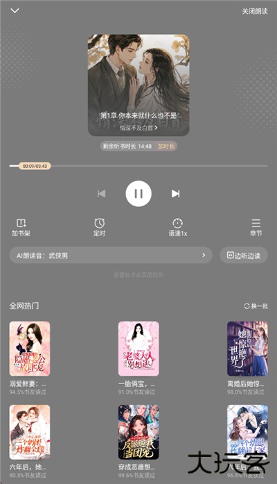 3、下载完即可跳转到听书界面,可在下方选择不同的AI朗读声音!