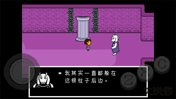 5、随后Toriel表示自己要离开一会儿,需要你独自一人往前走,这时候只需要直接往前走即可。其实Toriel就躲在出口的柱子后,她想要测试一下你的信任程度。随后她留下一个电话,并且表示你不要随便走动,如果有问题可以打电话给她,这时候可以打电话给Toriel打招呼、询问自己的状况、称其为“母亲”、联络感情。