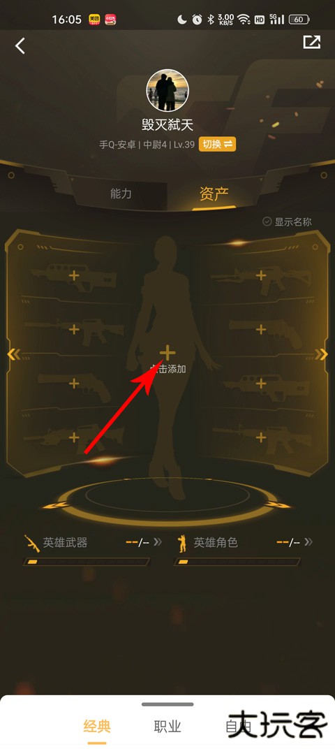 3、进入到个人资产页面之后,点击中间的添加就可以查看部分仓库道具了;