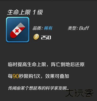 效果:临时提高生命上限,阵亡倒地后还原,初始等级每90秒限购1次,效果可叠加。