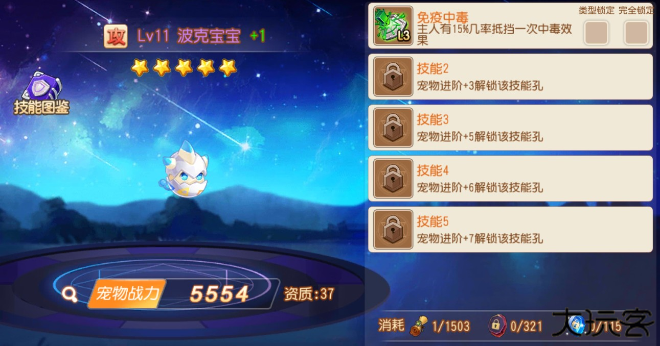 宠物技能系统是宠物输出的主要手段,具体技能大家可以点击技能图鉴,宠物达到+1会开启第一个技能孔,玩家可以通过消耗领悟之劵重新洗练宠物技能,其余技能栏位可以通过进阶开启,玩家可以点击类型锁定消耗封星石锁定该技能的类型,然后洗练等级,也可以点击完全锁定消耗封技石,就不会洗掉这个技能了呀。