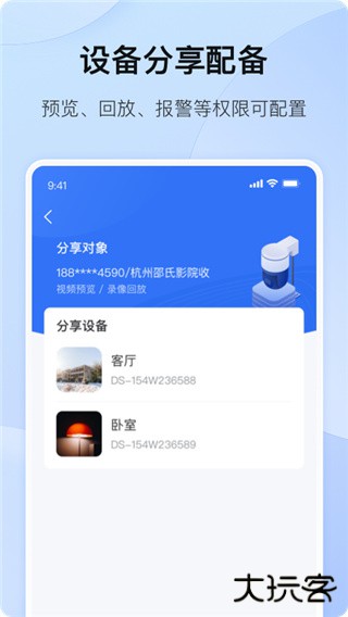 5、设备分享配备,预览、回放、报警等权限可配置。