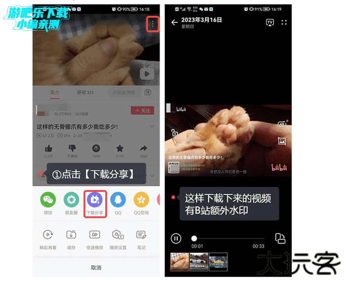 这个方法并不完美,通过这个方法下载来的视频带有B站额外的水印,不仅不适合保存反复观看,更不适合当素材使用。如果你不介意,B站视频下载就可以使用这种方法,步骤非常简单:在视频详情页点击右上角三个点,再点击【下载分享】即可保存到相册里了。