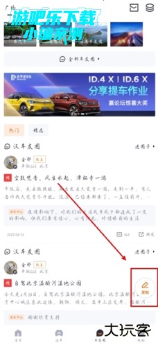 1、首先打开app进入【车友圈】界面,找到右侧的【发帖】;
