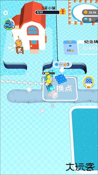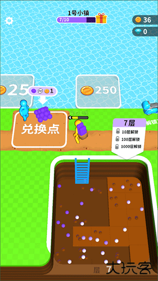 4、背包装满时,我们可以拿到兑换点进行兑换金币,拥有足够多的金币我们就能解锁小镇,雇佣工人帮助我们挖土;