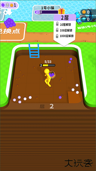 3、努力挖掘进行等级提升,这样可以提高我们的载货能力(载货能力越高,每次可以收集的小球就越多,就能兑换更多的金币,无需多次来回跑);