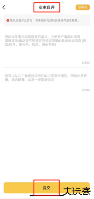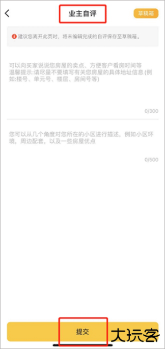 【入口一】:登录APP-点击【我的】-【我的委托】-进入委托房源详情页-【业主自评】–进行编辑和提交即可。