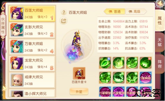 1、伙伴属性:伙伴升星可增加伙伴基本属性,升星卡可在师门闯关获得