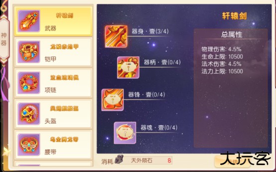 角色等级达到220级可开启神器,消耗神器材料可修复神器(大量增幅战力)(可优先升级)