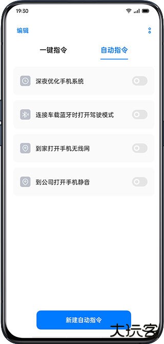 系统已经预设了几种常用指令:深夜优化手机系统;连接车载蓝牙时打开驾驶模式;到家打开手机无线网;到公司打开手机静音。