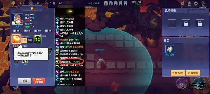 点击场上自己或队友的英雄,会显示当前英雄的属性情况,通过看最终伤害可以大致判断队友强弱以及天赋选择。