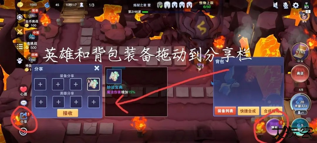 打开分享栏可以将自己的英雄和装备拖动到分享栏分享给队友(队友拿免费),自己也可以拿队友分享的(同样免费)。