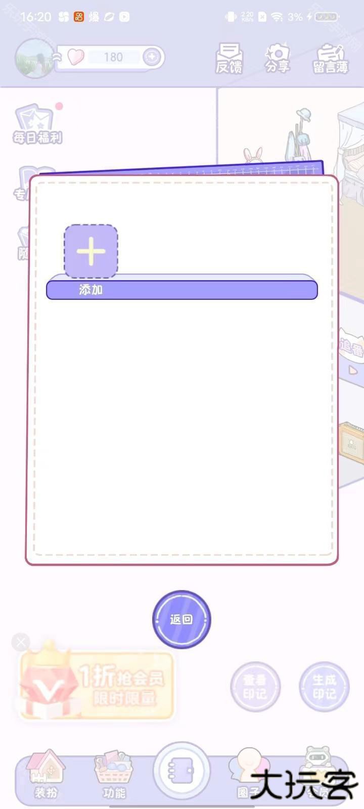 5、点击主页最中间的按钮可以使用手账功能,点击【添加】;
