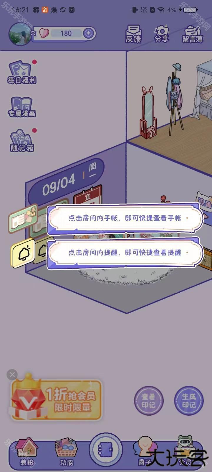 7、点击房间内的手账或提醒,即可快速查看;