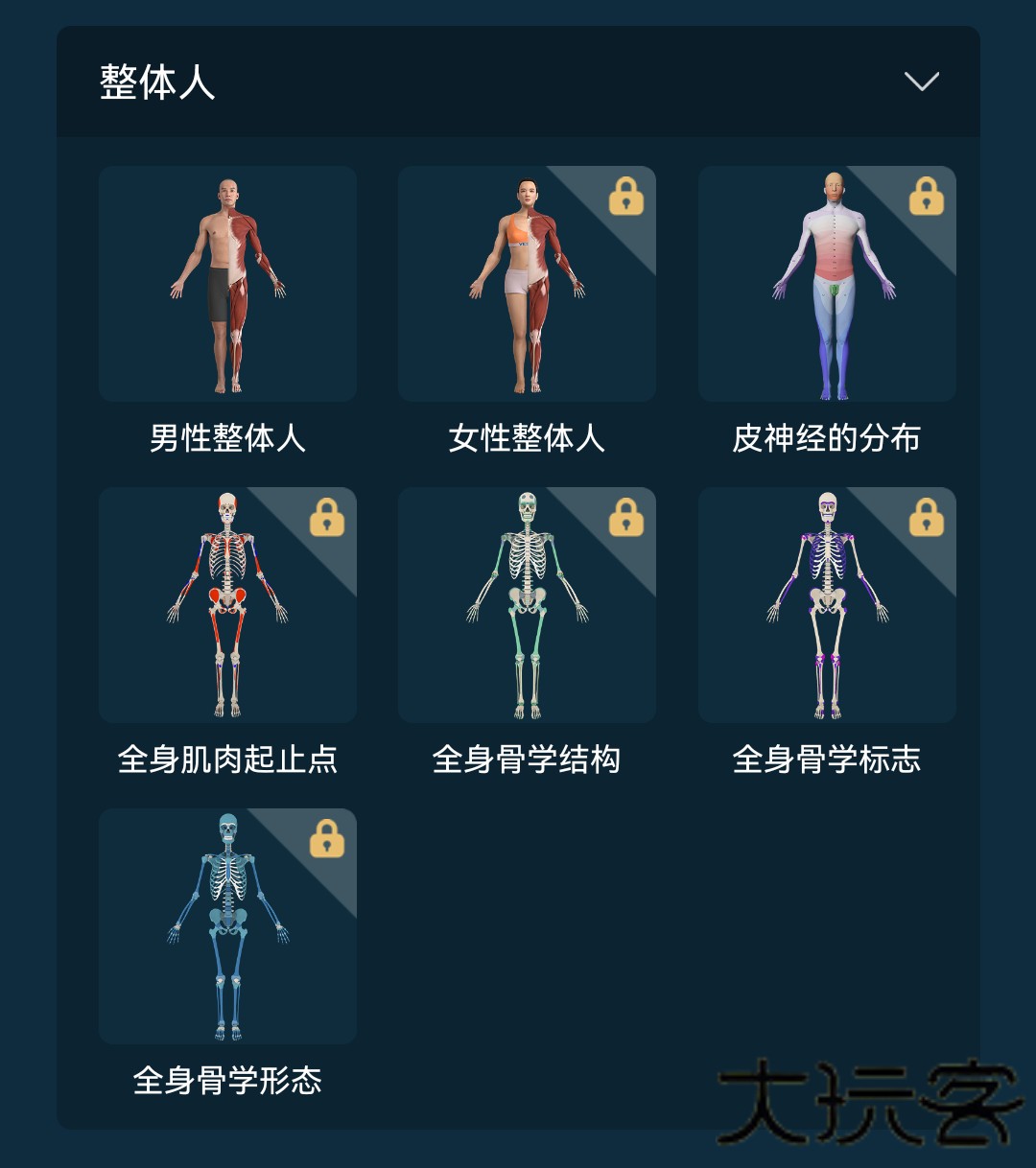 整体人是解剖大师3D人体虚拟解剖软件最强大的资源;男女整体人,各包括解剖结构15000+;包括皮神经分布、全身肌肉起止点、全身骨学结构、骨学标志、骨学形态;通过解剖大师隐藏,单选,多选,缩放,切割,旋转等功能,学习者可以充分了解人体的解剖奥秘。