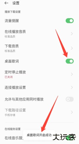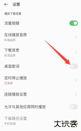 2、在【设置】页,找到【桌面歌词】选项,点击打开。