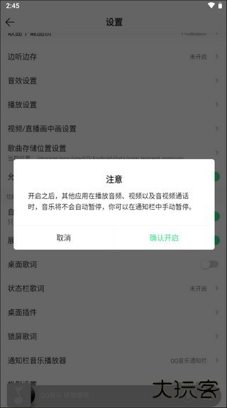 4、开启“允许与其他应用同时播放”开关后,qq音乐将不再会被中断播放,就算你打着微信电话钉钉视频也能继续放歌。