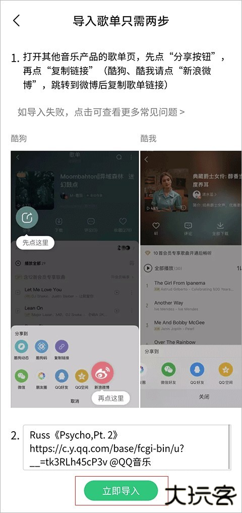 2、在导入之前需要先从其他音乐软件复制你要导入歌曲的链接,方法如下: