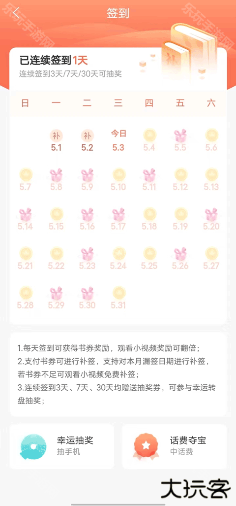 连续签到3天、7天、30天均赠送抽奖券,可参与幸运转盘抽奖。