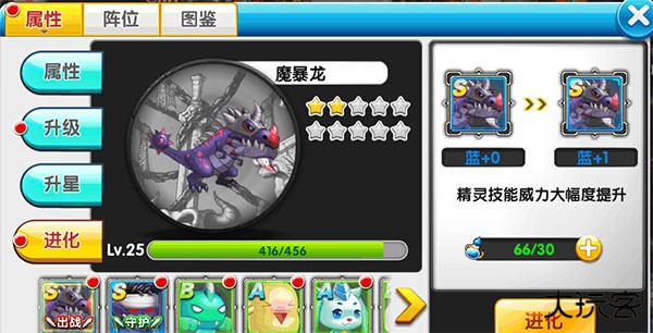 获得的同时也会有经验蛋糕的(给精灵涨经验的东东),到精灵的功能界面给你的“恶鬼同学”升升级吧。然后在祭坛中在用免费给的祭坛扭蛋抽一次,你会必定获得10个恶鬼精灵的碎片,拿着这些碎片能够给恶鬼精灵在生星。