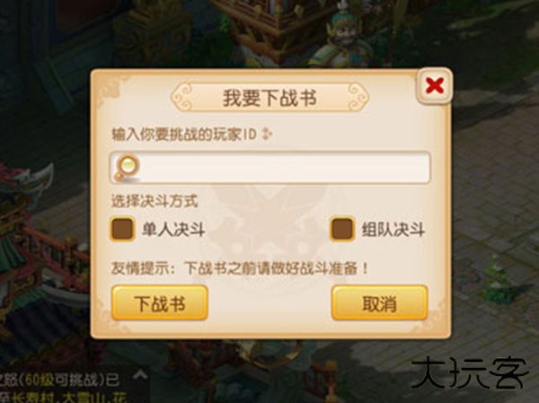 点击选项“我要下战书”,然后输入要挑战的玩家ID即可,战书下达后对方将会收到系统邮件通知;