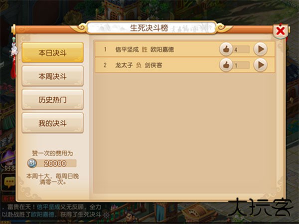 玩家可以在御林军统领处查看生死决斗榜,决斗榜包含“本日决斗”、“本周决斗”、“历史热门”、“我的决斗”,玩家可以查看决斗录像,对自己喜欢的决斗点赞。