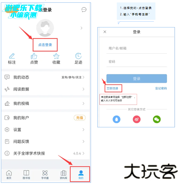 点击“我的-点击登录”进入登录页面,点击立即注册,可通过本人手机号注册登录。