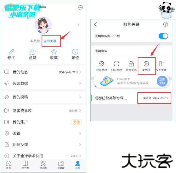 2. 击头像下方“立即关联”,在关联时读者需在正常登录的校园IP范围内(*须通过连接校园Wifi),点击立即关联,选择“IP关联”,即可关联成功,每次IP关联可以在校外使用15天;