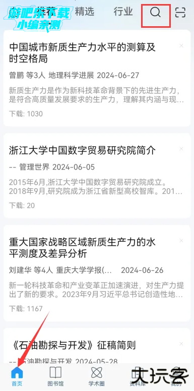点击首页右上角放大镜图标,可立即检索查询;“专题推荐”提供个性化推荐内容;最下方的“图书馆”、“资料库”和“我的”入口,可以对我们定制的各类资源、下载的文献等进行阅读和管理,以及对个人账户信息进行管理。