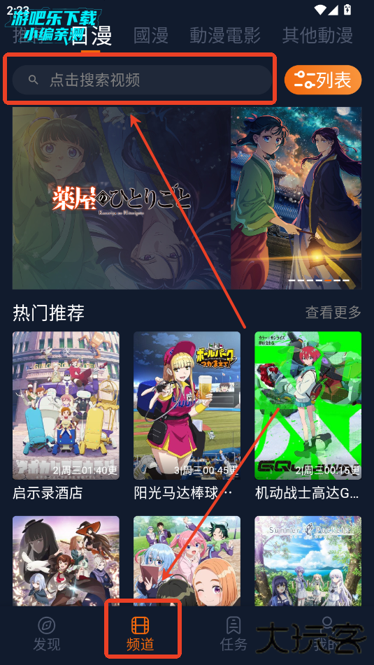 1.在频道栏点击上方搜索框。