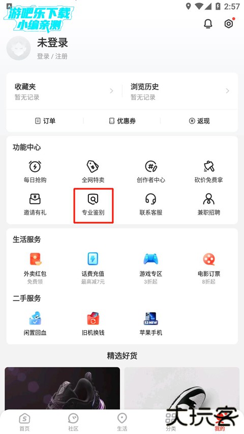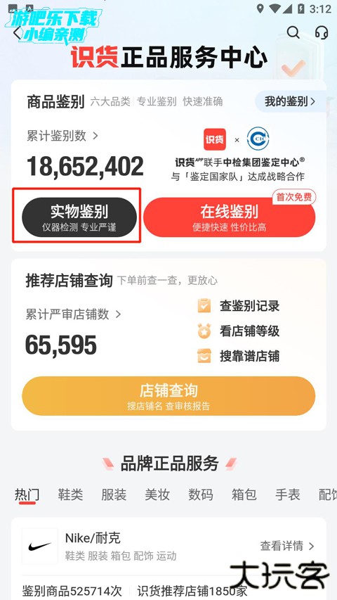 2、在识货工具栏处,点击专业鉴别,选择实物鉴别